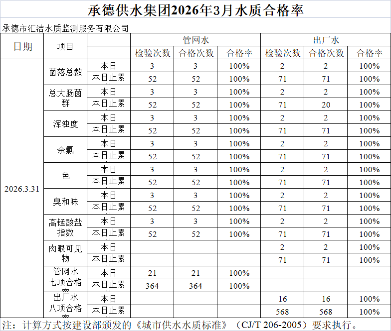 承德供水集團(tuán)2026年3月31日水質(zhì)合格率